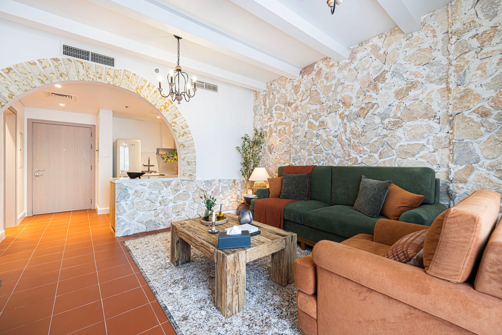 Dream in Italian by The Authors is a celebration of the good life. Ideal for 6 guests, this retreat is designed with an Italian touch, featuring brick textures that give the space character and charm. The kitchen brings the theme to life with rustic wooden cabinets, open shelving adorned with pottery, and bright lemon accents. The living room features a 120-inch cinema setup, and guests have access to a sparkling pool for a refreshing dip.