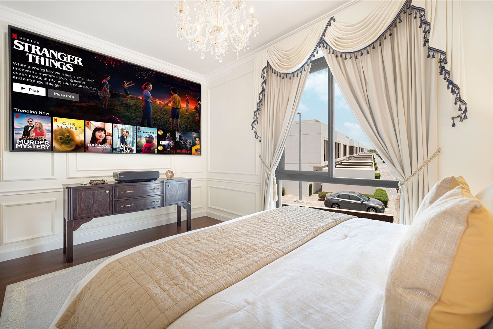 A fully equipped kitchen allows guests the ease of light cooking while travelling. A 120-inch projector in the master bedroom sets the scene for unforgettable movie nights snuggled up in bed. When it’s time to cool off, the villa offers access to a sparkling pool—perfect for a refreshing dip after a day of exploring.