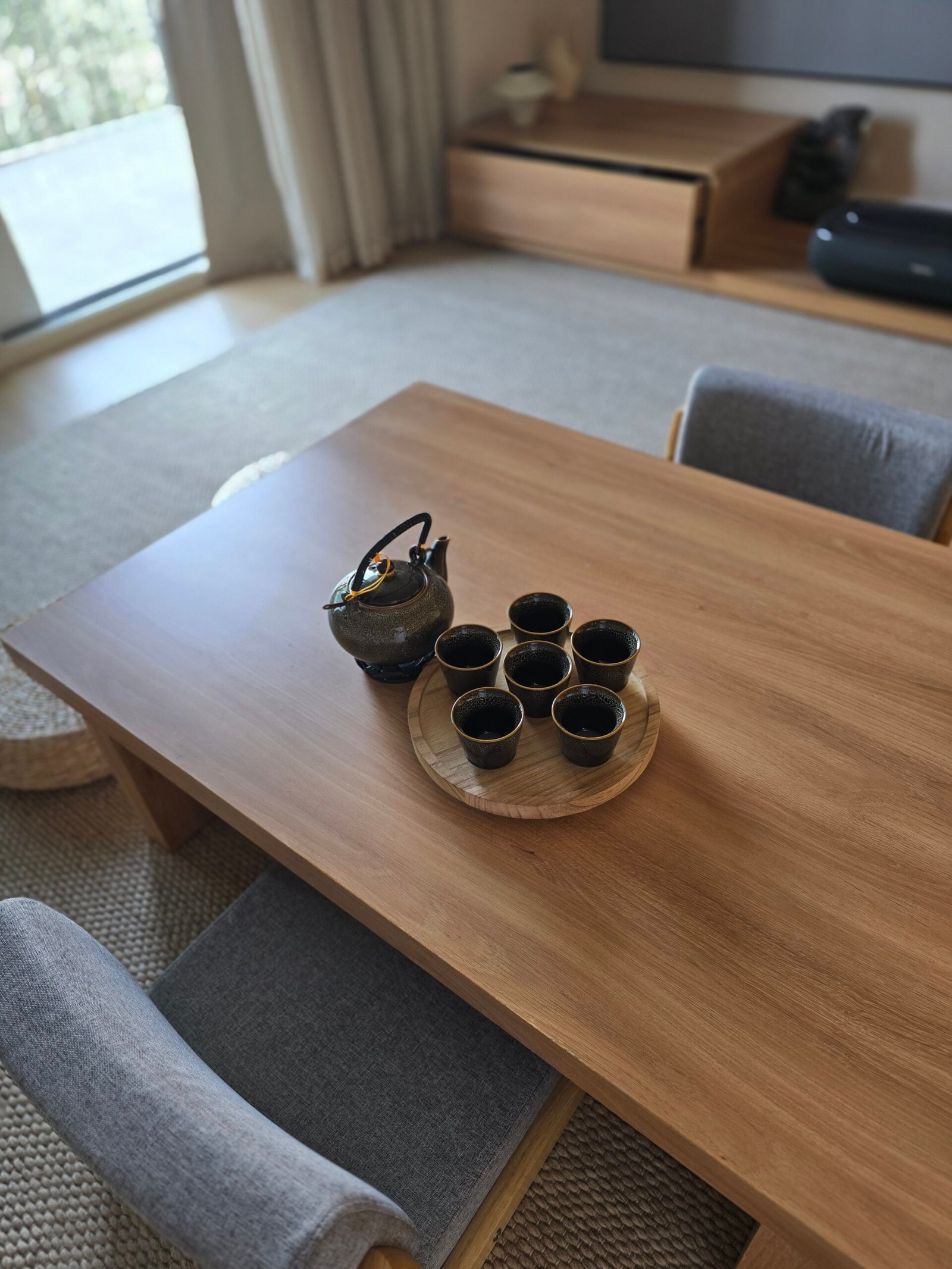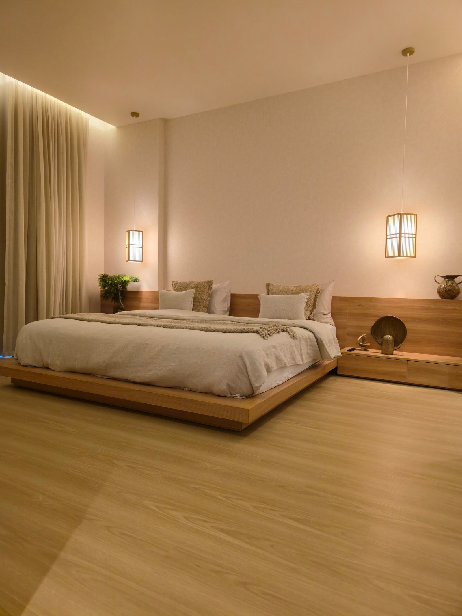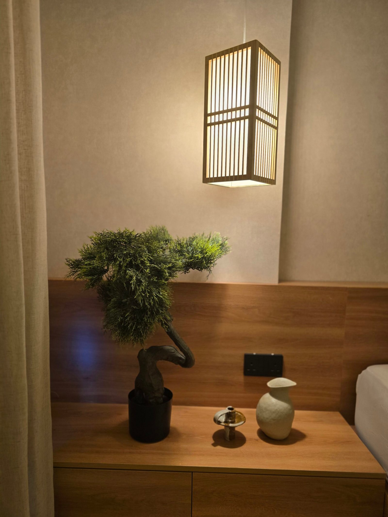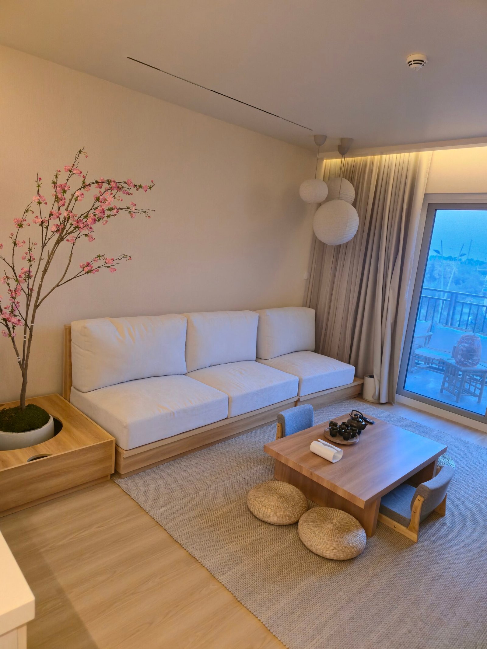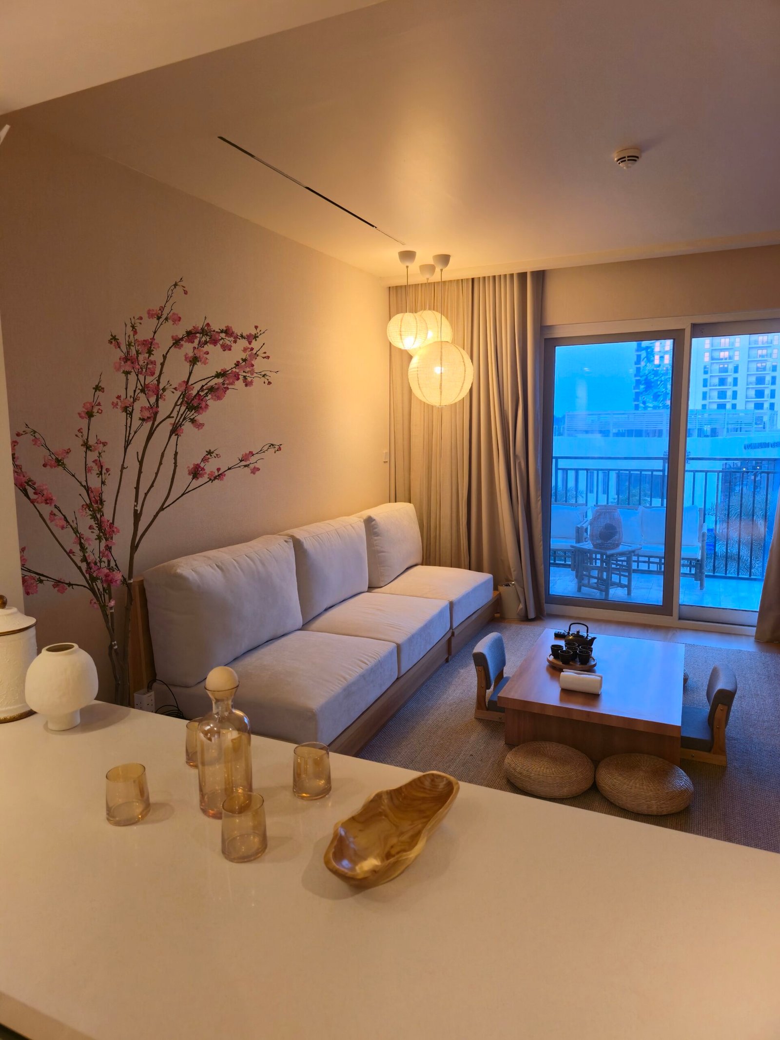 The Zen Chapter by The Authors on Yas Island is a space where stillness feels purposeful. Designed to host 6 guests comfortably, every corner allows room to breathe and unwind. Natural wood and soft linen bring warmth, while the fully equipped kitchen, with its pristine white island and a blooming cherry blossom tree, infuses calm into the heart of the home. Balance flows through the space, where a 120-inch screen invites evenings of shared films, and the sparkling pool offers a gentle respite when you need to cool off.
