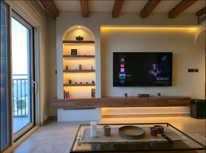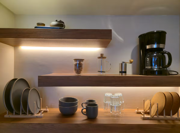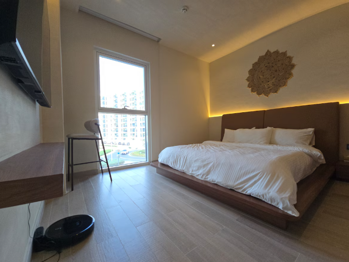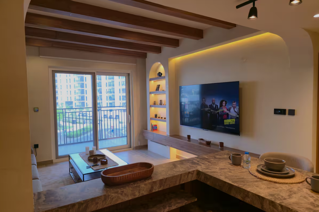 Wabi Sabi Suite by The Authors celebrates the beauty of imperfection, nestled on Yas Island. While the neighbourhood rejoices in the roar of the Marina Circuit, this Chapter at Waters Edge is grounded in quietude. The space is defined by natural textures and earthy tones, highlighted by a fully equipped kitchen with warm wood cabinetry and soft, serene lighting for slow mornings as the tea brews.
